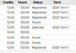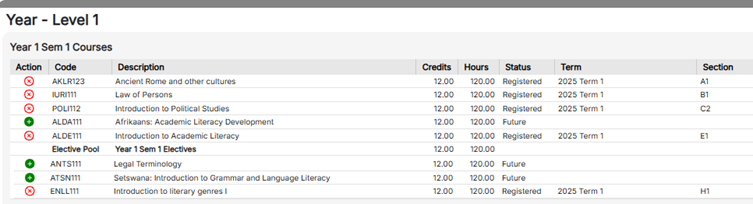 When registering, the list of courses (modules) for your qualification will appear in a table format. Please read each category in the table carefully.